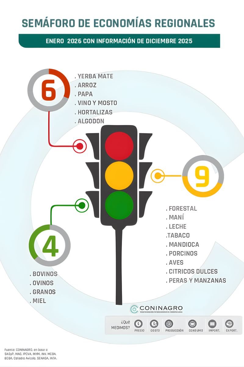 En términos generales, el Semáforo de Economías Regionales de Coninagro reflejó un escenario de recuperación heterogénea. El análisis se basa en tres componentes: negocio —que evalúa precios y costos—, productivo —que mide área, stock y producción— y mercado —que considera exportaciones, importaciones y consumo interno—.