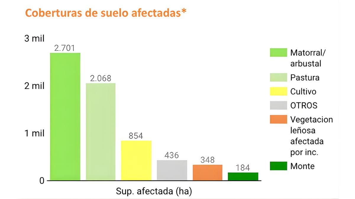 El gráfico difundido por IDECOR permite desagregar la superficie afectada según el tipo de uso del suelo. Allí se observa que, además de los matorrales y arbustales —que concentran la mayor superficie quemada—, las pasturas representan una fracción relevante del total, con 2.068 hectáreas afectadas. A este valor se suman 854 hectáreas correspondientes a cultivos agrícolas, lo que refuerza la incidencia del fuego sobre superficies vinculadas a la producción.