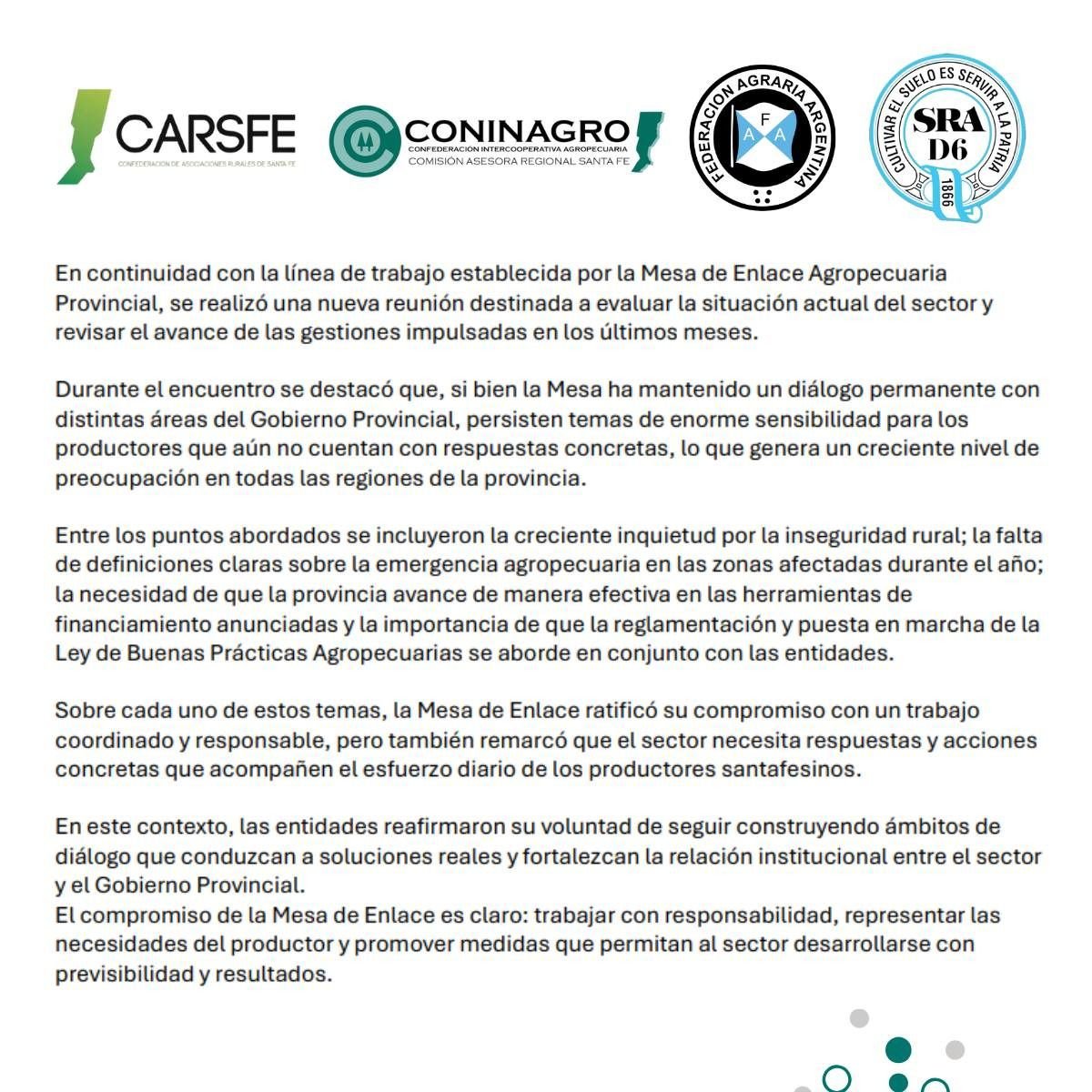La Mesa de Enlace sostuvo que mantiene un compromiso con el trabajo coordinado y responsable, pero advirtió que los productores necesitan respuestas concretas que acompañen el esfuerzo diario que realiza el sector en toda la provincia.