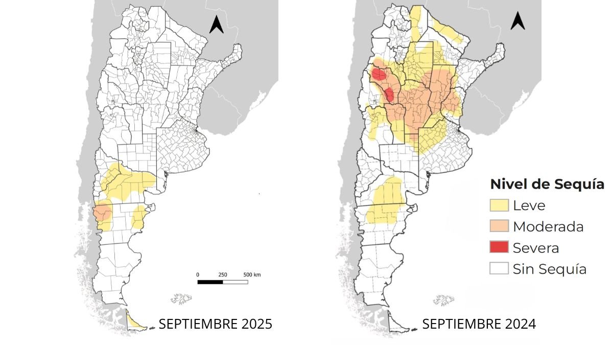 La superficie total afectada por sequía en Argentina se redujo de manera significativa durante septiembre, alcanzando el nivel más bajo registrado desde 2019. Así lo informó la Mesa Nacional de Monitoreo de Sequía, que detalló que “la superficie total afectada por sequía se redujo casi un 40 % respecto del mes anterior, concentrándose exclusivamente en la región patagónica”.