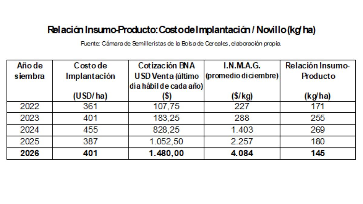 El análisis del contexto muestra una relación de precios particularmente favorable. El costo de implantación de pasturas, medido en kilos de novillo según el Índice Novillo del Mercado Agroganadero, se ubica alrededor de un 35% por debajo del promedio histórico. En términos productivos, esto implica que, con una conversión estimada de 15 kilos de materia seca por kilo de carne, los primeros pastoreos permiten recuperar prácticamente toda la inversión inicial.