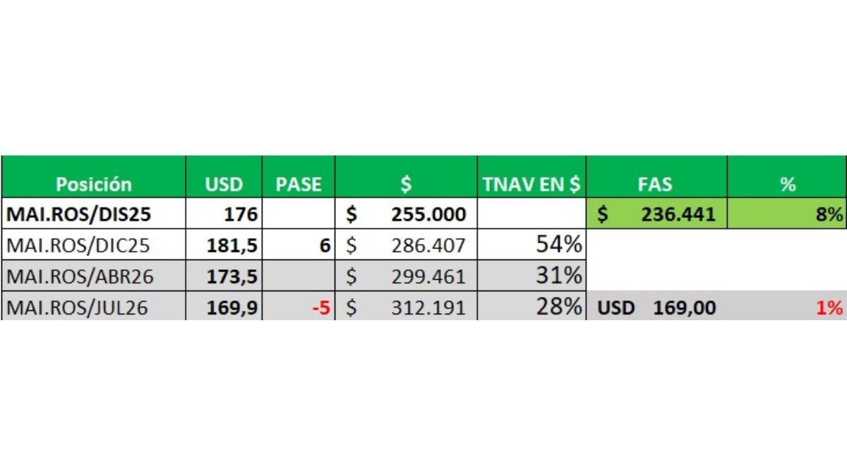 El 50 % del maíz 24/25 está sin fijar precio. Un maíz diciembre a casi U$S 182, +U$S 6 sobre el disponible, enciende luces verdes para capturar valor.