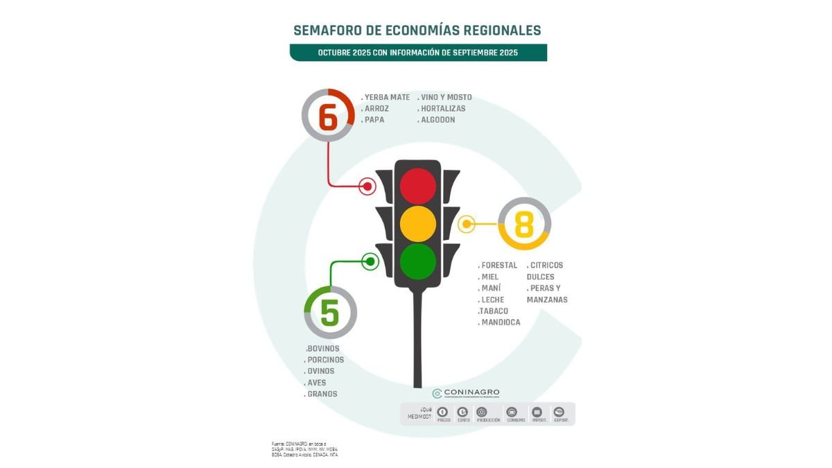 El retroceso del algodón se produce en un escenario general de heterogeneidad entre las economías regionales. Durante septiembre, el Semáforo de Economías Regionales registró cinco actividades en verde, ocho en amarillo y seis en rojo. Entre las primeras se encuentran los sectores bovino, porcino, aviar, ovino y de granos, que mostraron precios en alza y una mejora sostenida del negocio.