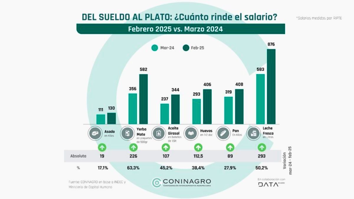 En ese sentido, el informe remarca que «entre marzo de 2024 y febrero de 2025, el salario medido por RIPTE ganó poder de compra frente a los seis alimentos básicos que monitorea CONINAGRO». Los incrementos más notorios se dieron en productos como la yerba mate (63% más poder adquisitivo), leche (50%) y aceite de girasol (45%), con aumentos significativos en las cantidades que pueden adquirirse con un salario promedio.