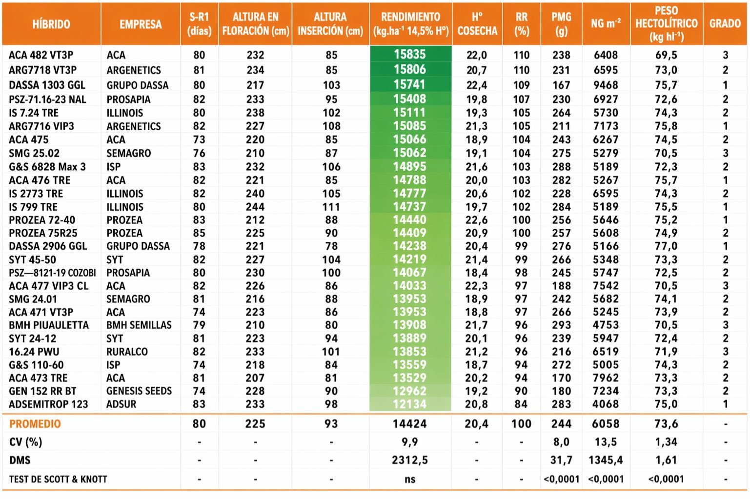 El rendimiento promedio del ensayo fue de 14.424 kg/ha, con un máximo de 15.835 kg/ha y un mínimo de 12.134 kg/ha.