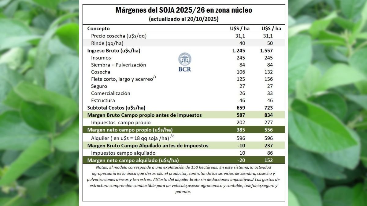 La siembra de soja de primera comenzó en la zona núcleo con buena humedad y márgenes mejores que en 2024, según la Bolsa de Comercio de Rosario. Sin embargo, los productores que alquilan campos deberán alcanzar rindes superiores a 40 qq/ha para lograr resultados positivos en una campaña marcada por altos costos y precios internacionales presionados por Brasil.