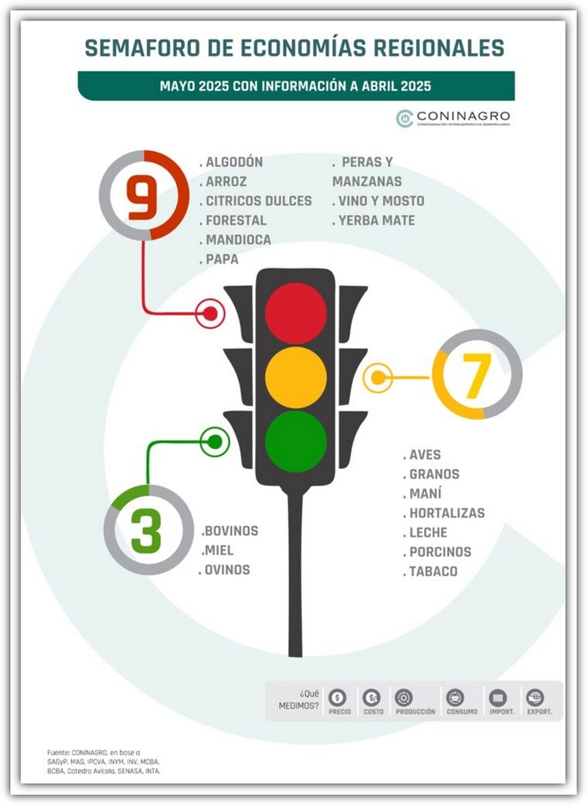 Para el mes de abril de 2025, el semáforo muestra que, si bien hay tres actividades en verde (un incremento respecto al mes anterior), siete se encuentran en amarillo y, lamentablemente, nueve continúan en rojo.