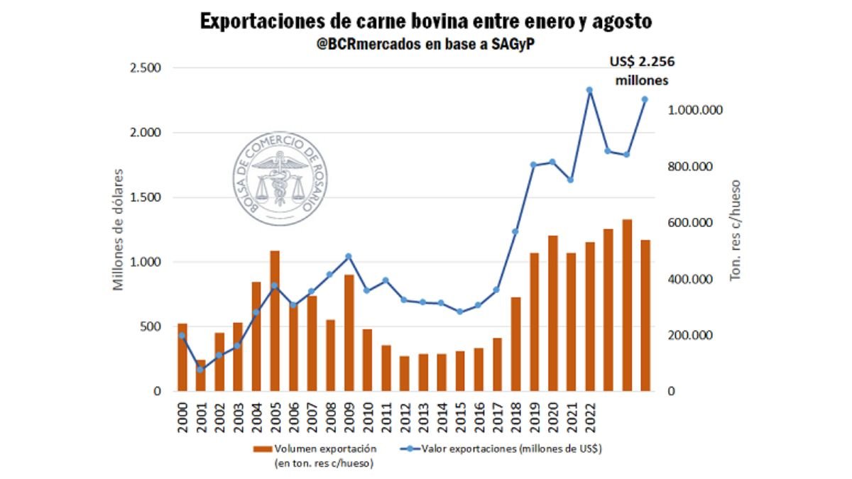 La producción y el consumo de carnes bovina, aviar y porcina mostraron incrementos interanuales durante los primeros ocho meses de 2025, de acuerdo con un informe del área de Investigación y Desarrollo de la Bolsa de Comercio de Rosario (BCR), elaborado por Franco Ramseyer y Julio Calzada. El trabajo destaca, además, el impacto positivo de los precios internacionales en las exportaciones de carne vacuna, que alcanzaron los 2.256 millones de dólares entre enero y agosto.