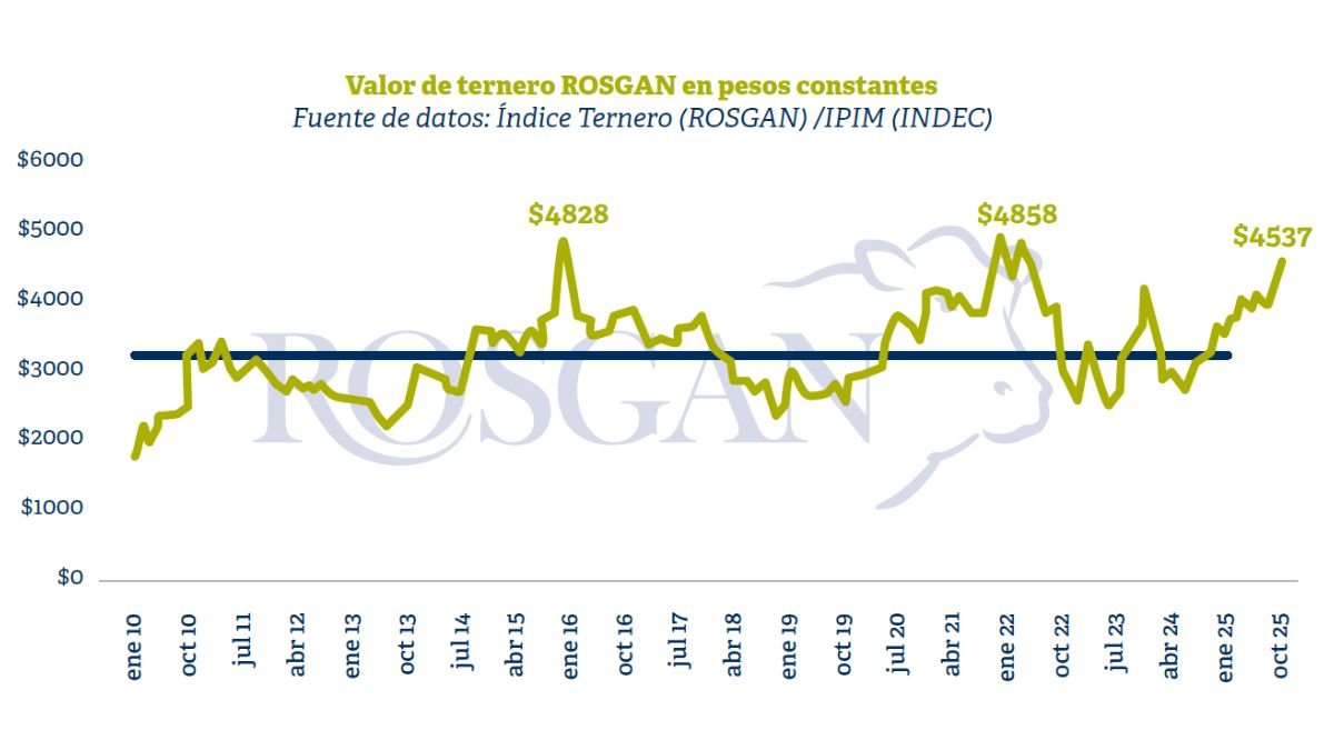 El Índice Ternero Rosgan se ubicó en $4.537 por kilo, un 8,1% más que en septiembre y un 47,9% por encima del valor registrado a comienzos de año. En términos reales, el informe destaca que el valor actual del ternero “se ubica un 40% por encima del promedio de los últimos 15 años, siendo el tercer valor más alto desde 2010”, superado solo por los picos de diciembre de 2015 y diciembre de 2021, ambos períodos marcados por “fuerte inestabilidad política y cambiaria”.