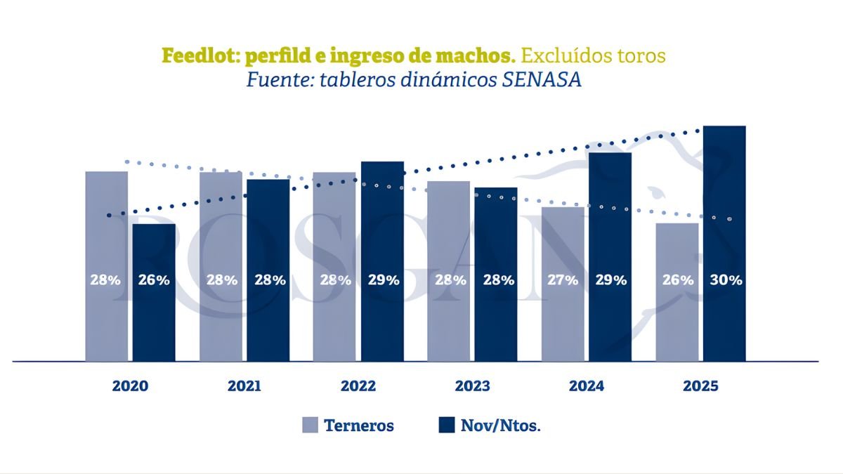 El cambio más relevante aparece justamente del lado de estos últimos. De acuerdo con el informe, en los últimos años se observa una caída en el ingreso de terneros livianos y un aumento de animales recriados que llegan a los corrales para su terminación. “En machos se ve claramente un mayor ingreso de animales recriados, a diferencia de otros años donde el grueso eran terneros livianos comprados en plena zafra”, explicó la analista.