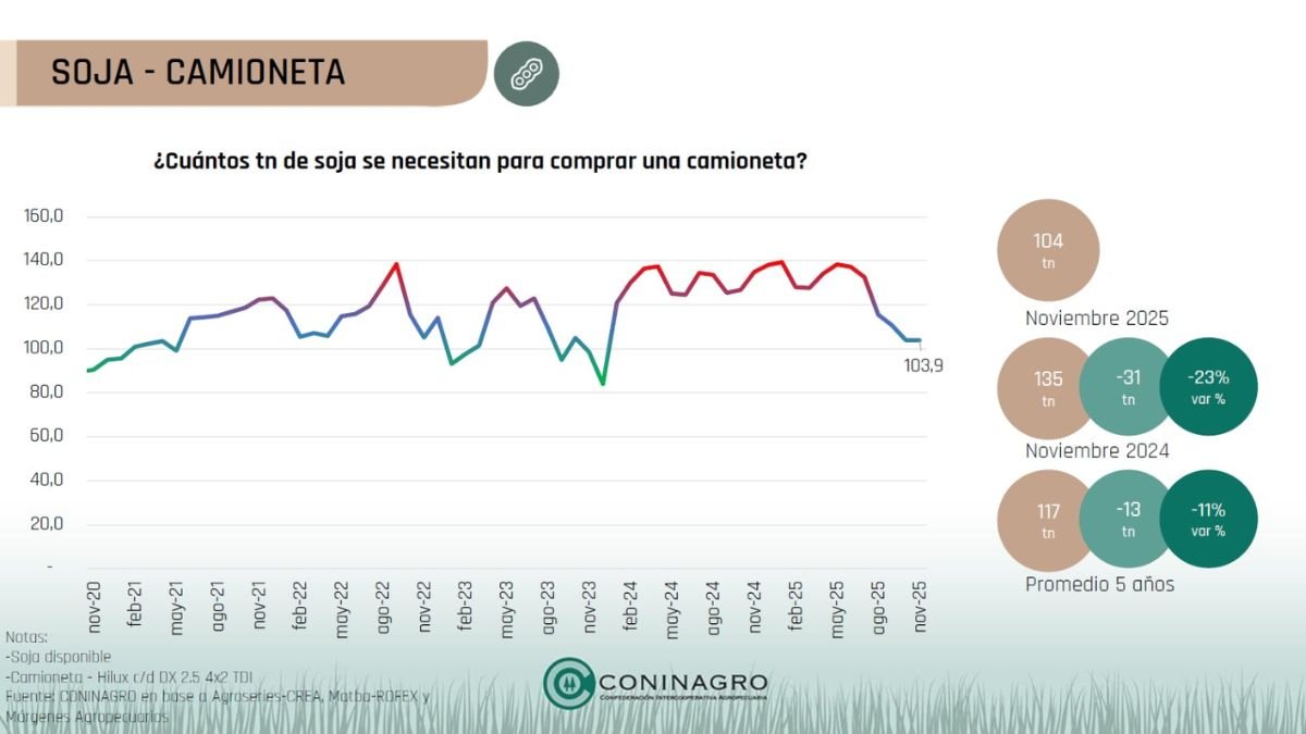 Para comprar una hectárea de campo se necesita casi la mitad de terneros que hace cinco años, o una camioneta se paga con 30 toneladas menos de soja que en la campaña pasada. Estos son algunos de los cambios que muestran las relaciones de poder de compra del agro en 2025, según el último Monitor de Relaciones Insumo-Producto, elaborado por CONINAGRO.