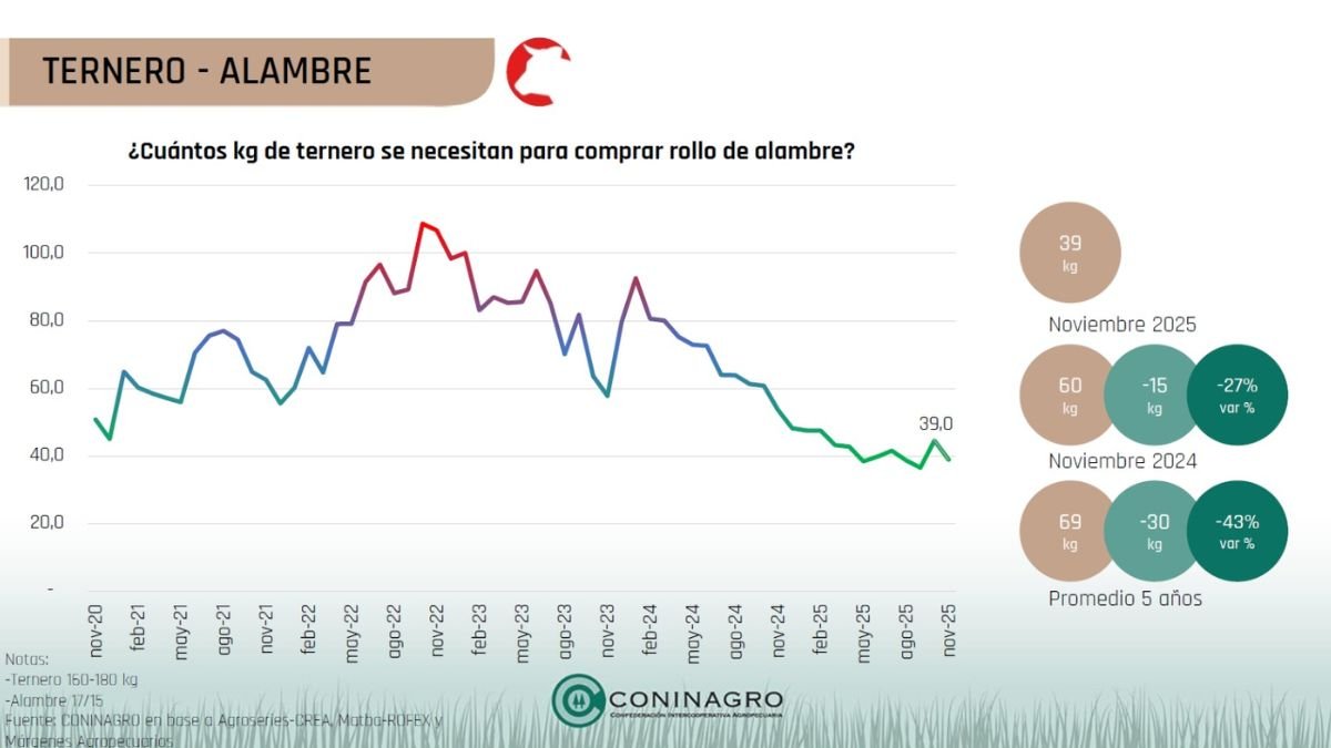 El último Monitor de Relaciones Insumo-Producto de CONINAGRO muestra una mejora significativa del poder de compra en la ganadería, con caídas de hasta 47% en los kilos de ternero necesarios para adquirir tierra frente al promedio de los últimos cinco años. En cambio, los granos exhiben avances parciales y la lechería y la yerba mate continúan con relaciones desfavorables en varios costos clave.