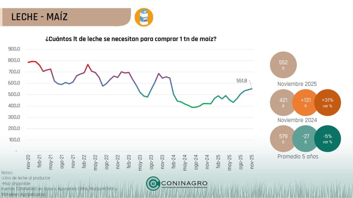 La lechería presenta un panorama más mixto. El trabajo señala que, si bien las relaciones interanuales no resultan favorables en varios casos, sí se observan mejoras cuando la comparación se hace contra el promedio de los últimos cinco años. Para comprar una tonelada de maíz hoy se necesitan 552 litros de leche, frente a 421 litros en 2024, lo que implica un deterioro interanual del 31%, aunque todavía se ubica levemente por debajo del promedio histórico de 579 litros.
