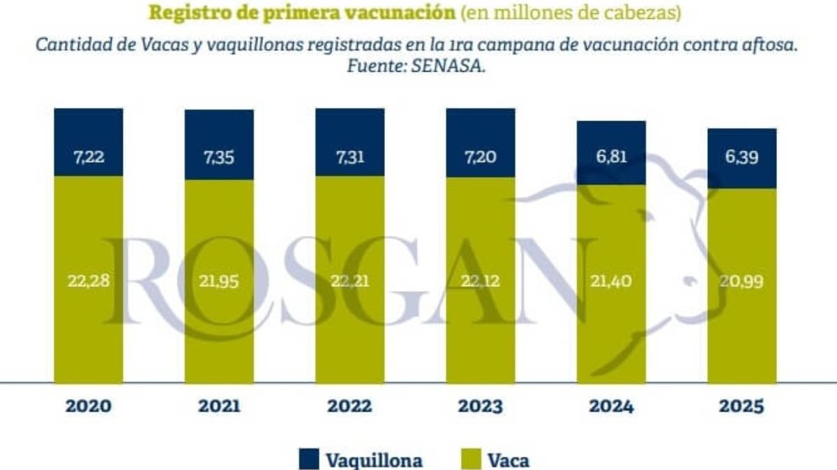 Un informe del Rosgan, basado en datos oficiales del Senasa, confirmó una nueva caída en la cantidad de animales vacunados en la primera campaña contra la fiebre aftosa 2025, con una fuerte pérdida de vacas y vaquillonas, clave para la reposición del rodeo.