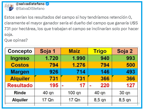 La completa eliminación de los derechos de exportación generaría un incremento sustancial del precio interno de la soja; como los alquileres agrícolas se miden en quintales de ese poroto, entonces los propietarios de campos arrendados pasarían a tener un ingreso muy superior sin realizar ningún esfuerzo.