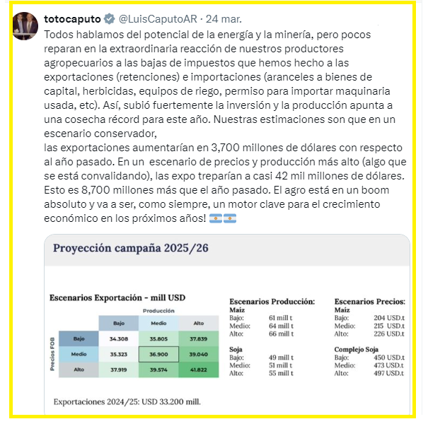 “Todos hablamos del potencial de la energía y la minería, pero pocos reparan en la extraordinaria reacción de nuestros productores agropecuarios a las bajas de impuestos que hemos hecho a las exportaciones (retenciones) e importaciones (aranceles a bienes de capital, herbicidas, equipos de riego, permiso para importar maquinaria usada, etcétera)”, aseguró el ministro Luis “Toto” Caputo en redes sociales.