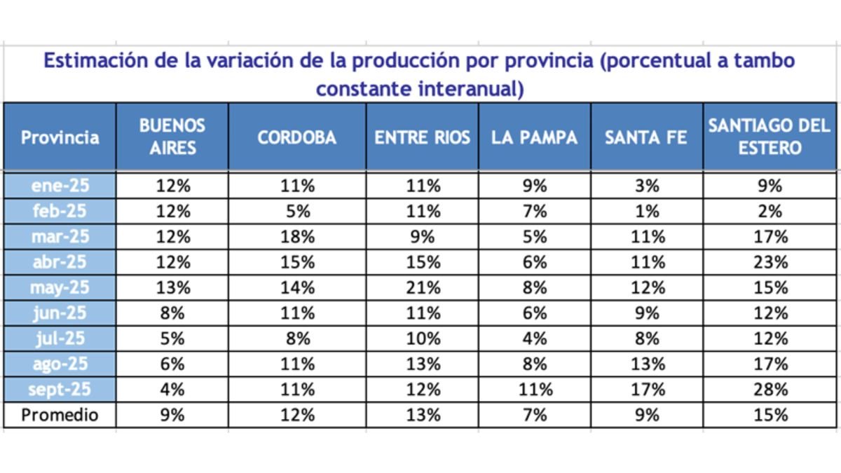 Durante el período enero-septiembre de 2025, la producción de leche mostró importantes diferencias según la provincia. En promedio, Entre Ríos (+13%), Córdoba (+12%) y Santiago del Estero (+15%) fueron las jurisdicciones con mayores incrementos interanuales, mientras que Buenos Aires (+9%), Santa Fe (+9%) y La Pampa (+7%) registraron crecimientos más moderados.