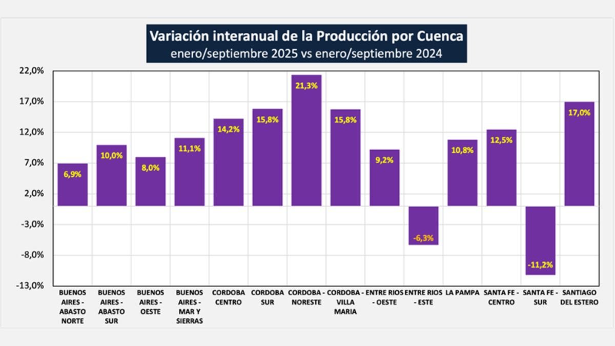 Las cuencas bonaerenses tuvieron resultados moderados: Abasto Norte (+6,9%), Abasto Sur (+10%), Oeste (+8%) y Mar y Sierras (+11,1%).