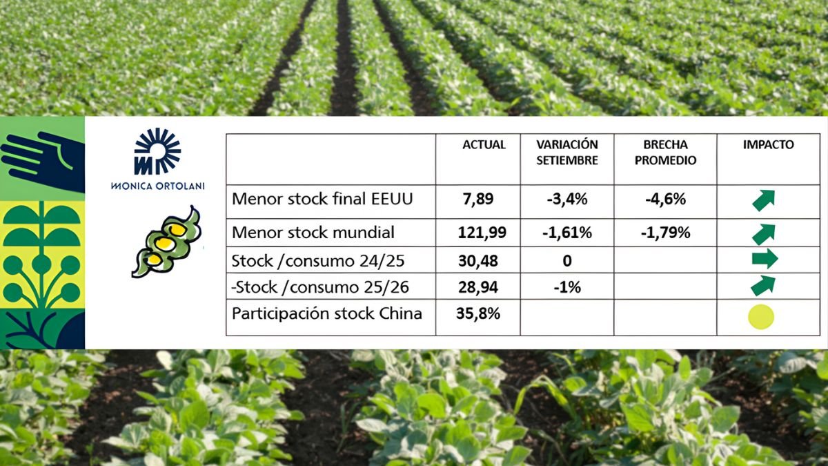Se ajustó a la baja el stock final de EE. UU. y mundial, ubicándolos 4,6% y 1,8% por debajo de los promedios, respectivamente. Esto, sumado a la demanda china (importaciones proyectadas en 112 Mt), crea un balance más estrecho y una señal de firmeza, ajustando a la baja la relación stock/consumo.