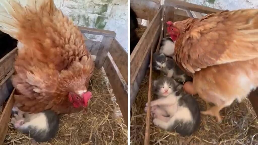 Una mamá gallina amplía su familia de manera sorprendente, cuidando a unos gatitos recién nacidos.