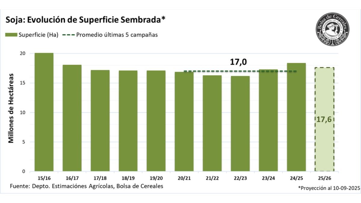La Bolsa de Cereales de Buenos Aires (BCBA) publicó su informe de pre-campaña 2025/26 y anticipó que la superficie destinada a soja en Argentina se reducirá un 4,3 % interanual, pasando de 18,4 a 17,6 millones de hectáreas. “El área se mantendría como la segunda más elevada de los últimos cinco ciclos y superaría el promedio del mismo período”, señaló la entidad, a pesar de que el ajuste interrumpe la tendencia alcista de las últimas cuatro campañas.